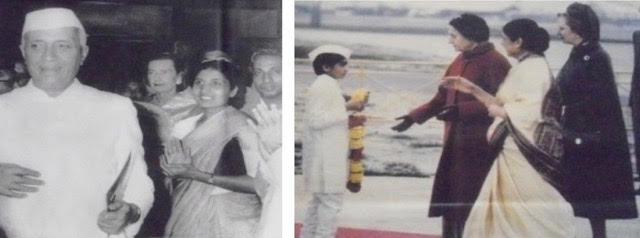 1) Caroline Job with PM Pt. Nehru and lady Mountbatten in India House, London…2) CarolineJob receiving PM India Gandhi with her young son Rajan (with garland)and UK’s PM Margaret Thatcher at London Airport…